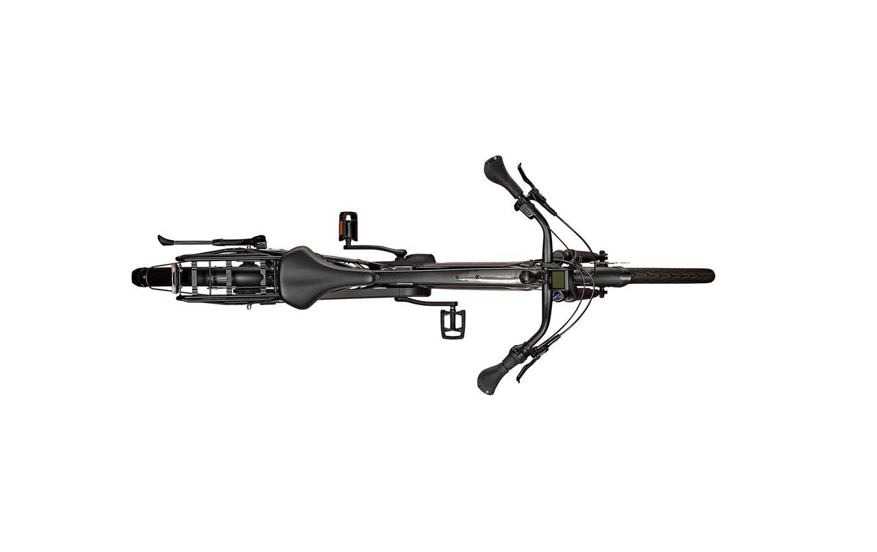 The SR Suntour NEX E25 HLO suspension fork and suspension seat post absorb bumps with ease, while the ergonomic Ergon GC10 grips and Selle Royal Essenza Plus saddle enhance rider comfort for long days in the saddle. -